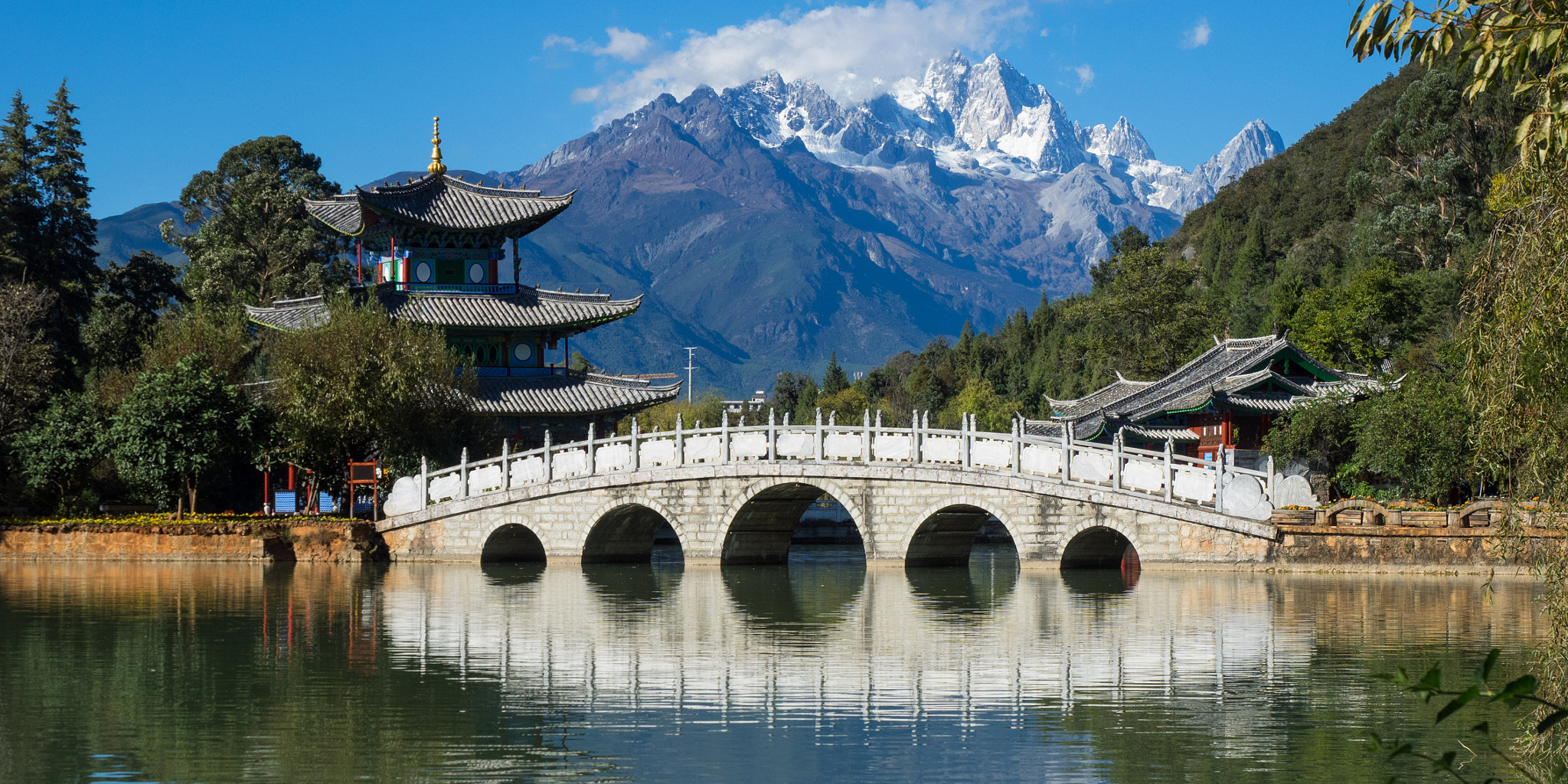 Der Drache, den wir meinen, ist der Jadedrachen Schneeberg, den Sie von Lijiang aus sehen können. Er befindet sich in unmittelbarer Nähe der Stadt. Der Berg hat eine Höhe von fast 5.600 m, Sie werden heute einen Teil des Berges per Seilbahn bewältigen. Auf mehreren Station in unterschiedlicher Höhe gibt es schön angelegte Spazierwege, die Sie bewandern können. Sie besuchen heute weiterhin noch den Teich des Schwarzen Drachen, eine Parkanlage in der Innenstadt von Lijiang. Sie ist besonders bekannt für die Spiegelungen des Jadedrachen Schneebergs im Wasser des Teichs.